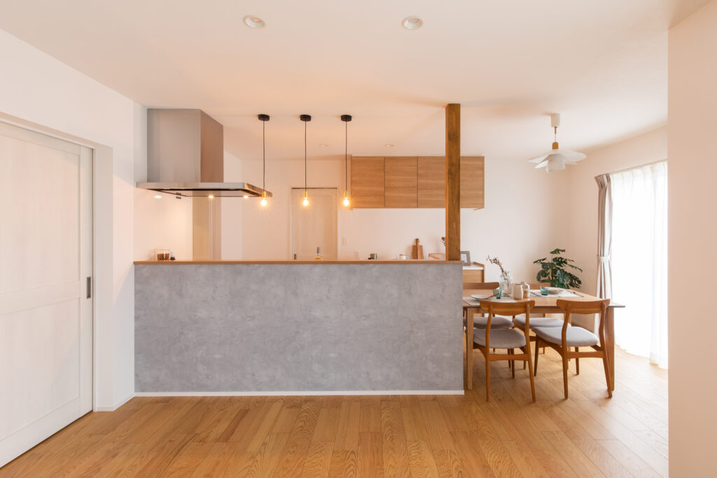 やわらかなグレージュの壁紙と白木調のフローリングがつくる、やさしい雰囲気。16帖のLDKは、ふたりで過ごす時間にも、家族や友人を招く時間にもぴったりの広さです。ペニンシュラ型キッチンは、料理をしながら会話が弾む開放感。玄関クロークには濡れたコートを掛けられるハンガーパイプを備え、日々の暮らしをスマートに。脱衣室と洗面室を分けた間取りは、来客時にも安心の仕様です。さらに、太陽光発電で電気代の負担を軽減し、家計にもやさしい暮らしを実現。「のびのびと」「無理なく」、そして「心地よく」。夫婦二人でも、家族と一緒でも、毎日がちょうどよく満たされる住まいです。