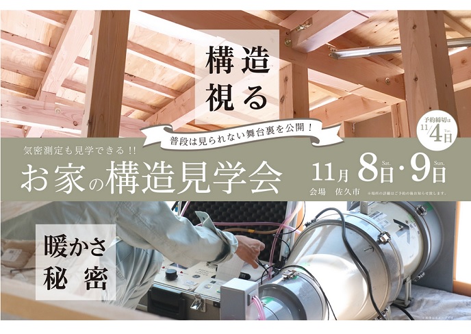 11/08土・11/09日 ①10:00〜/②11:30〜/③14:00〜/④14:00〜(構造見学会) ① 10:00〜/②14:00〜(気密測定) 佐久市原<<<普段は見ることのできない舞台裏を大公開!>>>