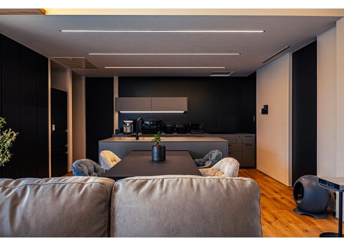 天井高2.6mの開放的なLDK。各所に間接照明を効果的に配置し、非日常的で洗練された空間を作り出しています。