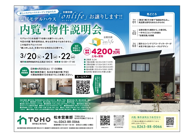 03/20金・03/21土・03/22日 10:00〜17:00 塩尻市広丘高出1940-6モデルハウスを抽選で1名様にお譲りいたします。今回の内覧・物件説明会は、単なる見学会ではありません。この塩尻モデルハウスの「購入申し込み」を受け付ける特別な3日間です。
