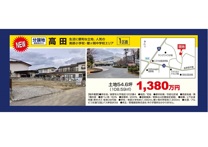 物件概要 ■所在地/長野市大字高田1202番4 ■地目/宅地 ■都市計画/市街化区域 ■用途地域/第1種住居 ■建ぺい率/60% ■容積率/200% ■道路幅員/東側4m(位置指定道路) ■設備/上下水道完備・都市ガス・駐車3台可能 ■学校/南部小学校(約1,400m)、櫻ヶ丘中学校(約1,600m)■交通/アルピコ交通「日詰」バス停徒歩3分 ■売主/長電建設株式会社 仲介手数料はかかりません。
